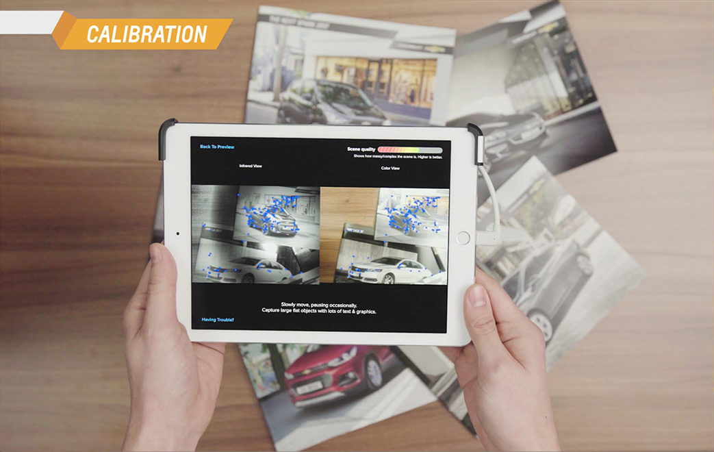 Adding a depth and structural sensor with a wide-angle lens to an iPad, we created a device that could scan any space and bring a virtual car into it.